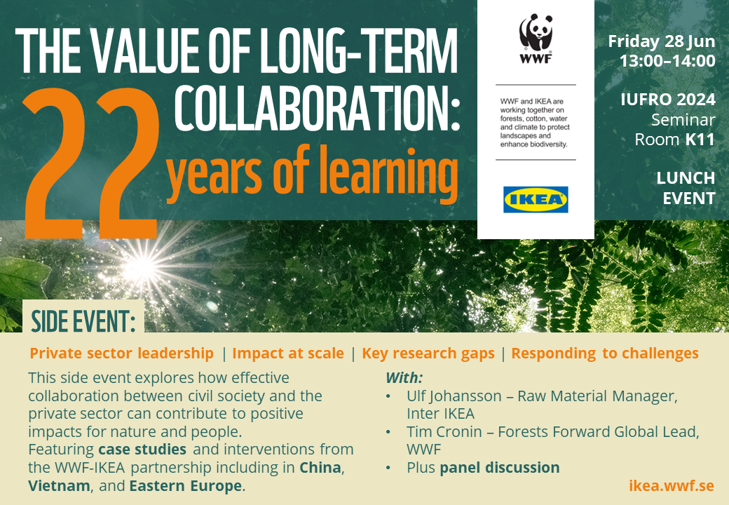 13:00-14:00, Side event: The value of long-term collaboration: 22 years of learning with WWF and IKEA: This side event will focus on innovations embraced in the WWF-IKEA partnership, the approaches adopted to adapt and respond to complex local ecological, social, and institutional contexts, and the strategies embraced to scale impact while balancing trade-offs. The side event will feature collaborative interventions in China, Vietnam, and Eastern Europe.